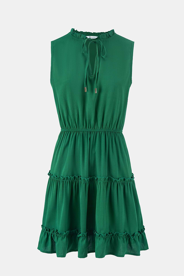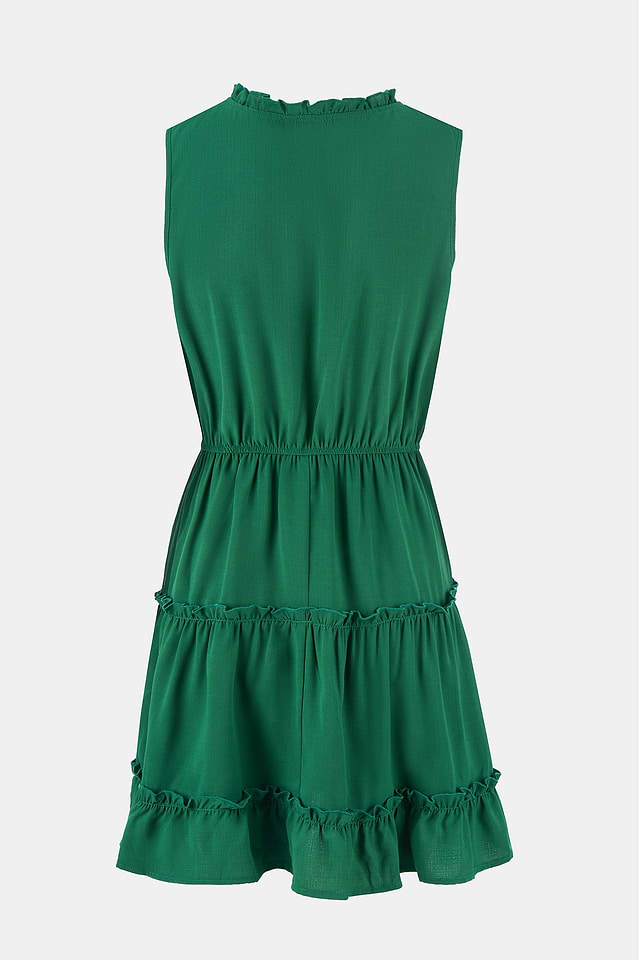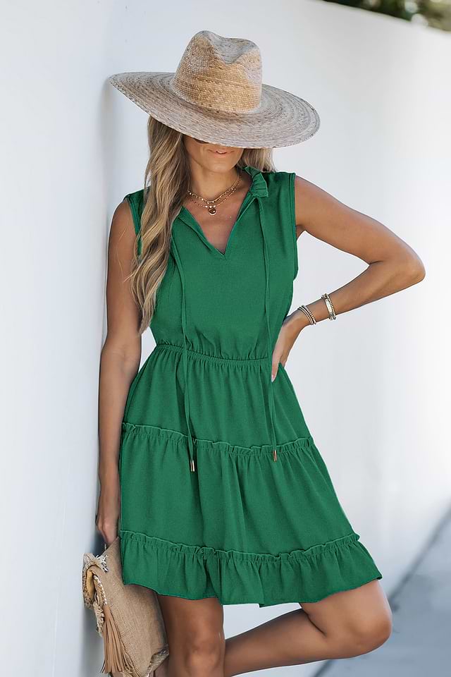 ¡Disfruta de todos tus sueños clásicos americanos con el minivestido All American Green! Con un diseño sin mangas con escote entallado y detalles con volantes, esta prenda agregará un aire retro a tu guardarropa.