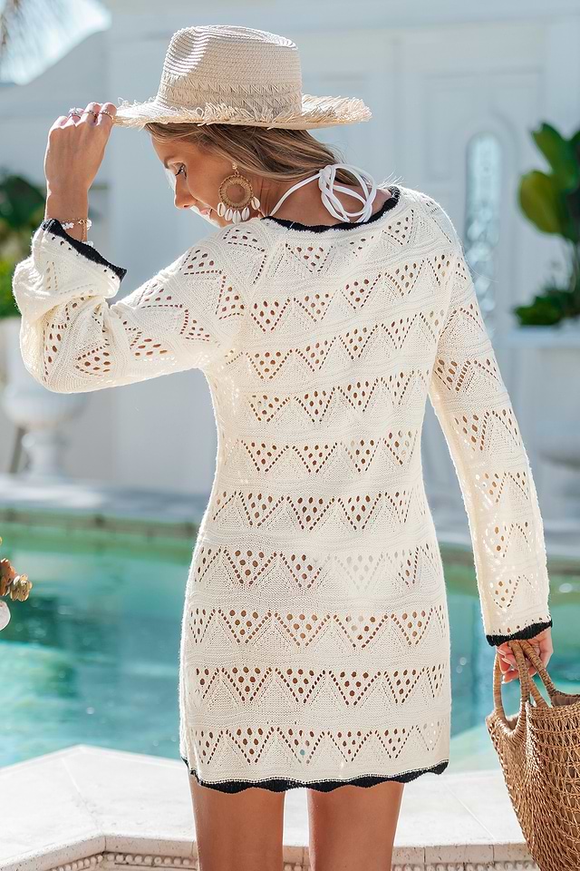 El minivestido beige Amaze es ligero y fresco, ideal para el sol. Su escote redondo, mangas largas y largo mini crean una silueta relajada y divertida.