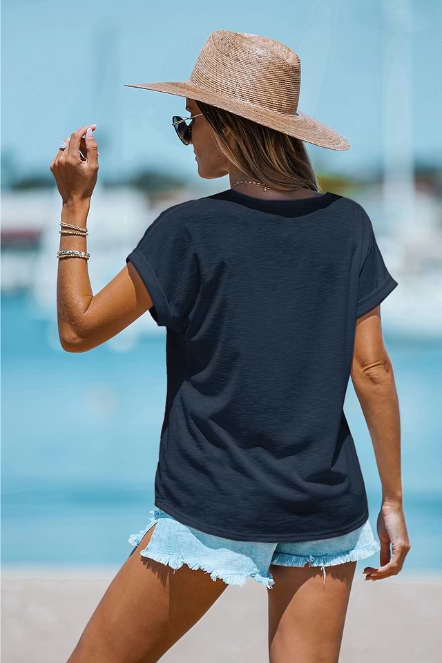 ¡La camiseta azul auténtica es sencilla y auténtica! Su escote en V, mangas cortas, transparencias y un tacto relajado le dan un estilo versátil que se puede usar en capas o sola.