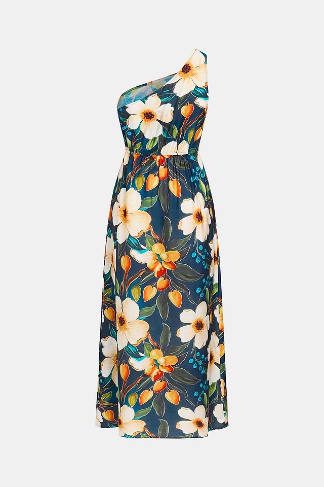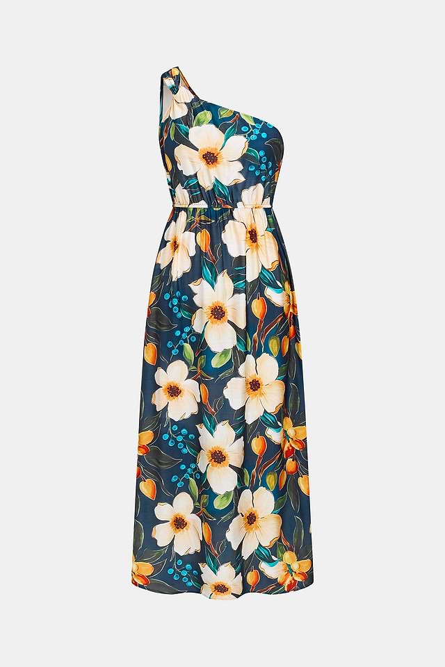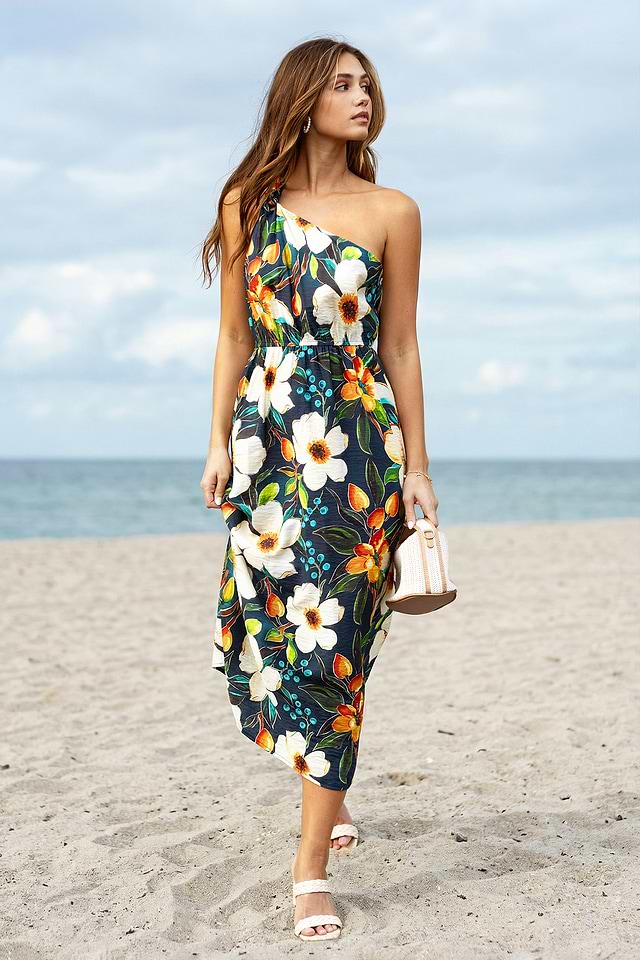 El vestido midi floral Bahamas Glow es una prenda fresca y elegante para los días cálidos. Su escote asimétrico y corte sin mangas le dan un toque fresco, mientras que su largo midi le da un acabado relajado y desenfadado.