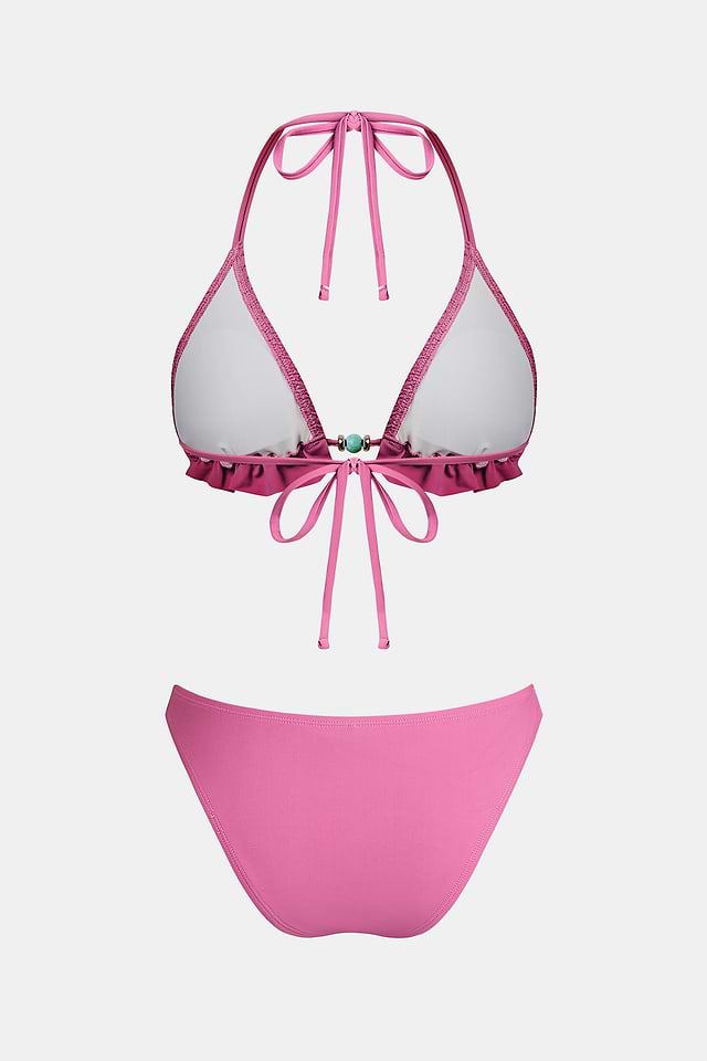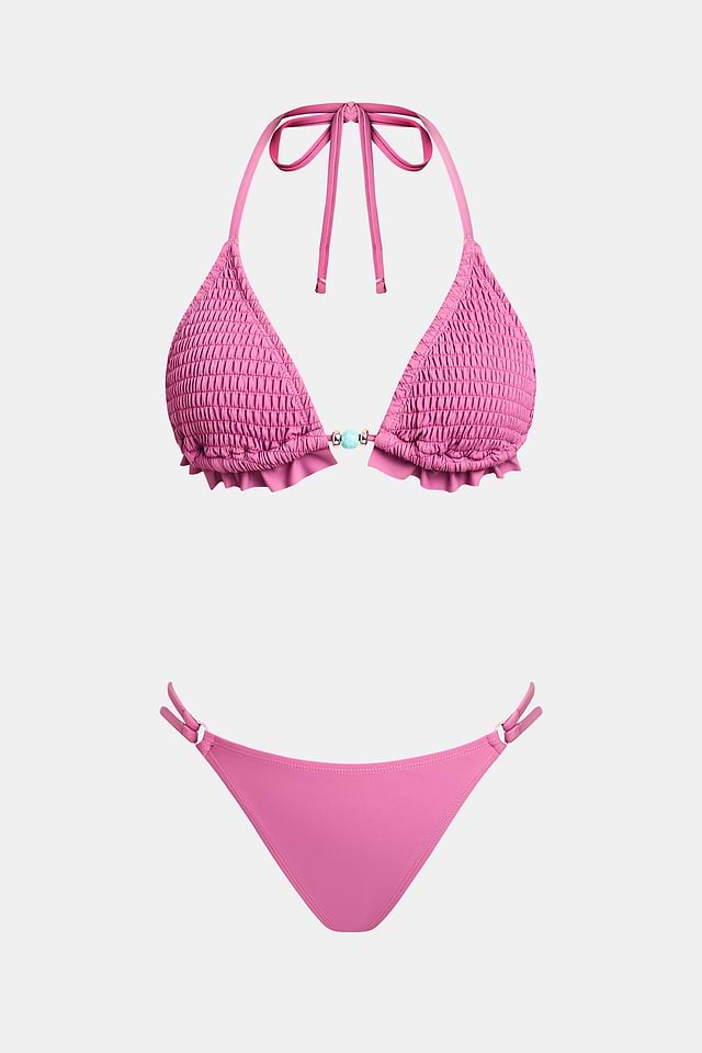 ¡El conjunto de bikini Sandcastles Mauve te trae un aire relajado y soleado! El escote de diamante con tirantes halter ofrece una ligera sujeción del busto, mientras que el tiro bajo y el corte alto de la pierna lo hacen cómodo y divertido, ideal para días de playa interminables.