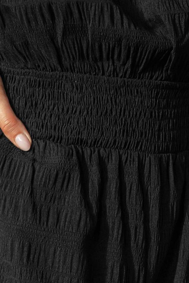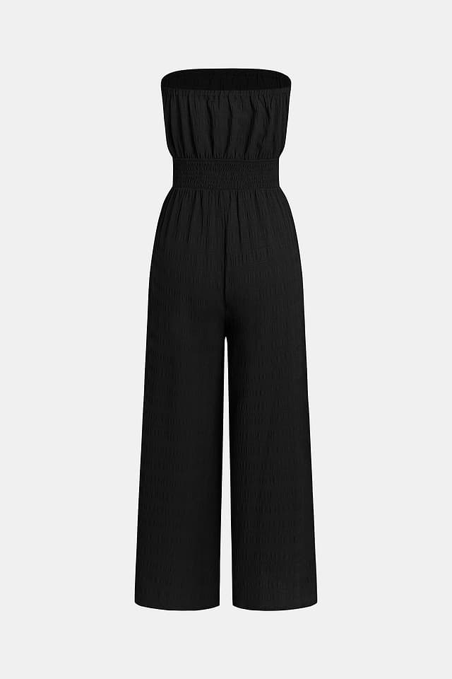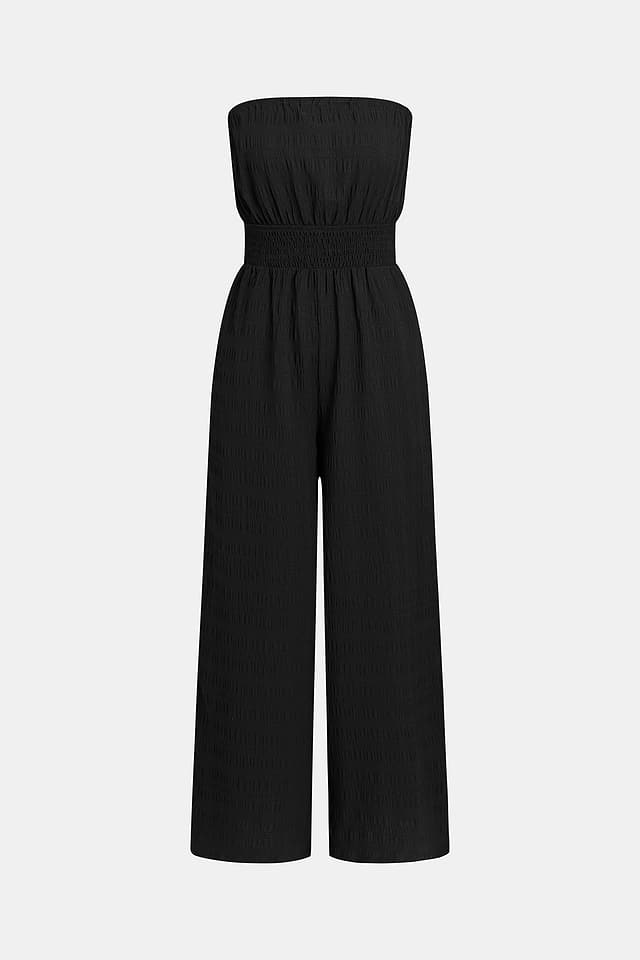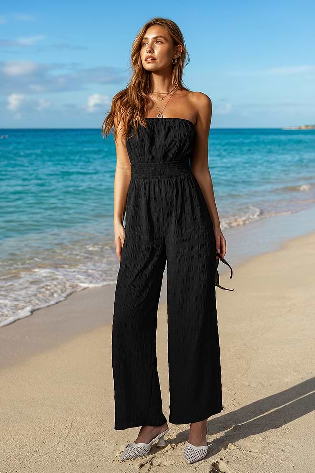 El mono negro Sunset Over the Cays captura ese momento isleño cálido y relajado. El escote recto y el corte sin mangas mantienen la frescura, mientras que la cintura fruncida y la silueta de pierna ancha crean un ajuste relajado y favorecedor.