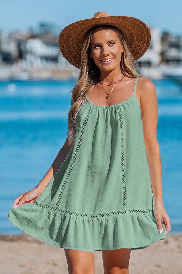 El minivestido Beach Belle Green es la personificación del encanto playero. Con escote redondo, tirantes finos y paneles transparentes, este minivestido tiene una caída fluida, mientras que el bajo con volantes le añade un toque coqueto.