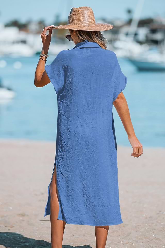 El vestido midi azul Beachside Queen aporta energía, seguridad y elegancia a tus días en la piscina y más allá. Con cuello, mangas cortas, cierre de botones y largo midi, es fácil de poner y quitar, pero a la vez te hace sentir elegante y lista para tus planes soleados.