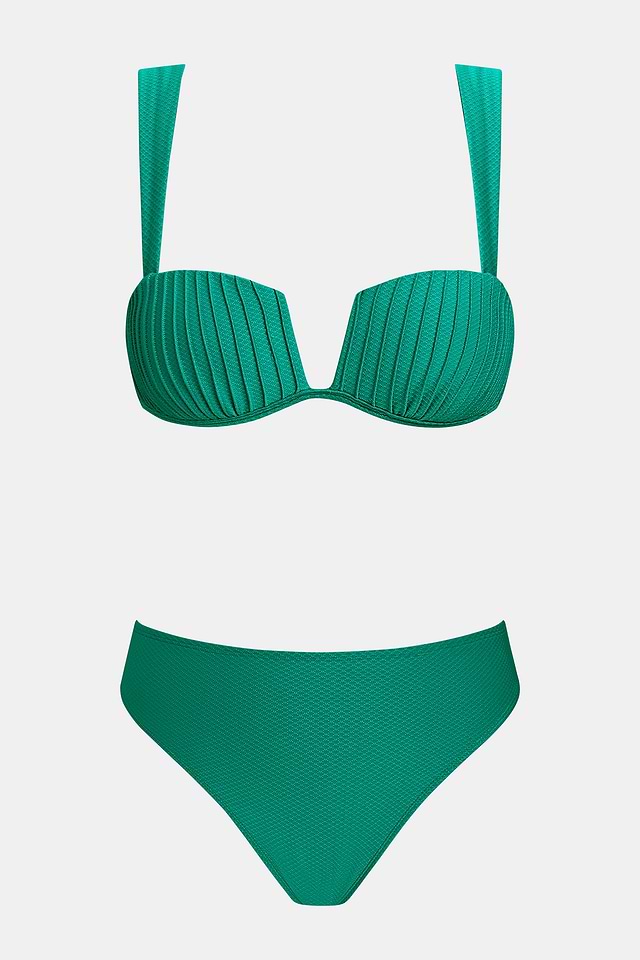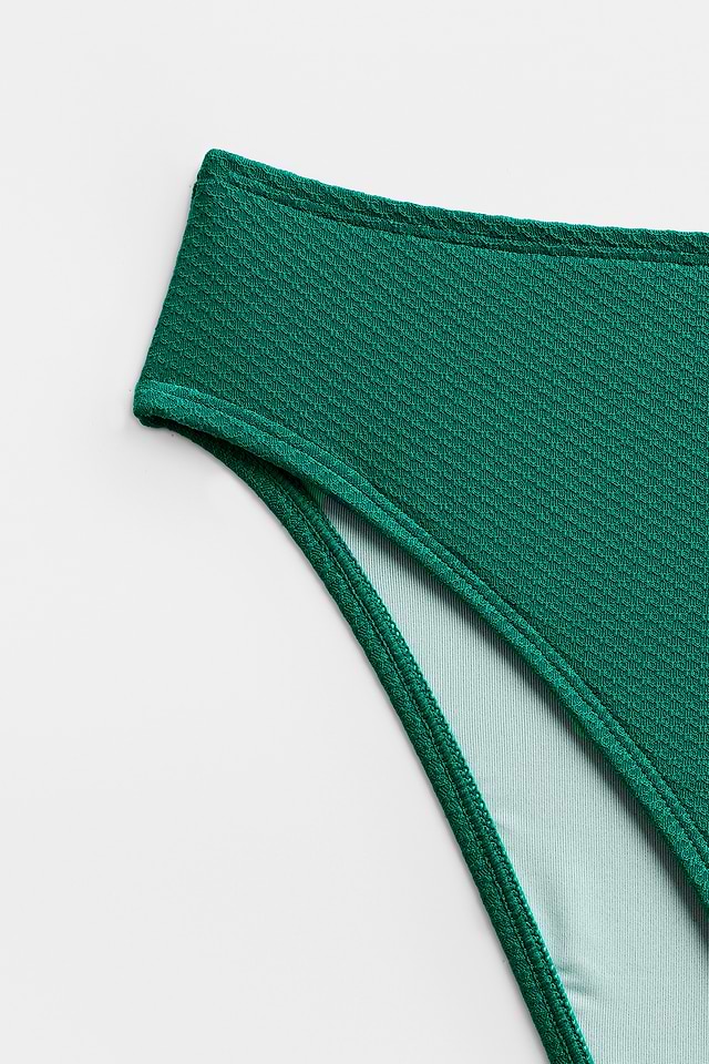 El conjunto de bikini verde Beachside Siesta es perfecto para relajarse en la playa. Su escote en forma de diamante, tirantes ajustables y copas moldeadas con soporte alto para el busto garantizan un ajuste cómodo y seguro, mientras que el corte a media pierna y la cobertura moderada de los glúteos ofrecen una silueta equilibrada y favorecedora.