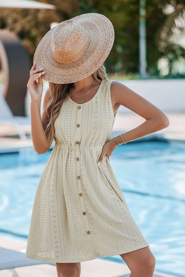 El minivestido beige de punto con escote redondo y sin mangas ofrece un estilo desenfadado gracias a su suave tejido de punto y su favorecedor escote. Ideal para esos días en los que quieres lucir impecable sin esfuerzo.