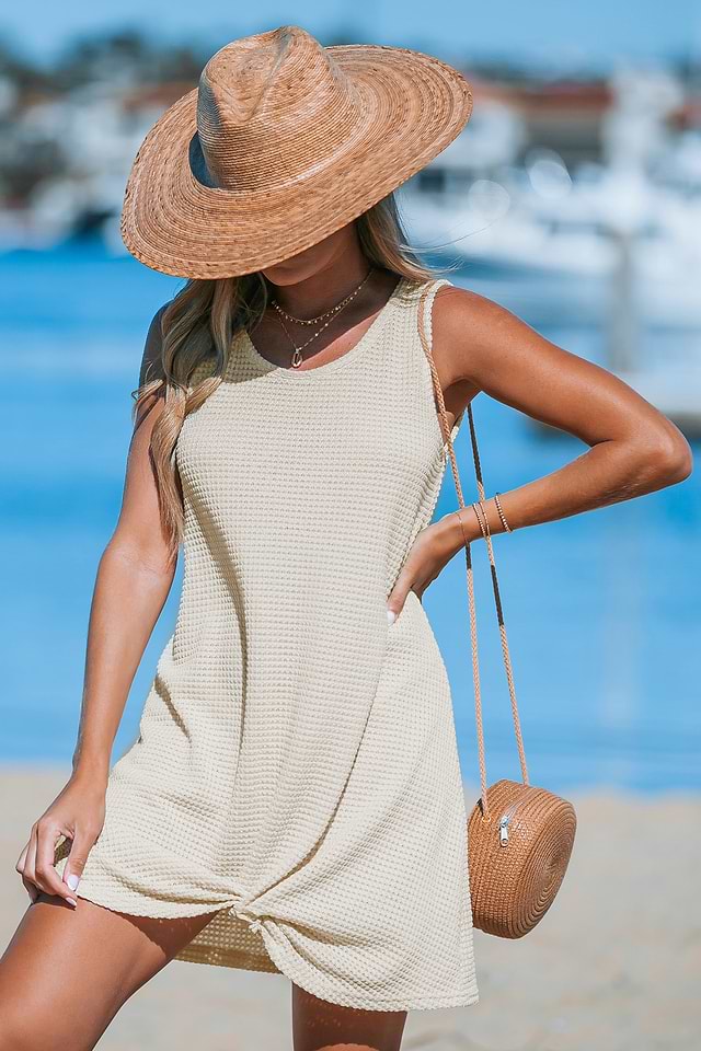 Nuestro pareo beige con dobladillo de punto tipo gofre ofrece una apariencia relajada pero elegante con su acogedor tejido de punto tipo gofre y detalles discretos que brindan comodidad sin esfuerzo para sus aventuras junto al mar.