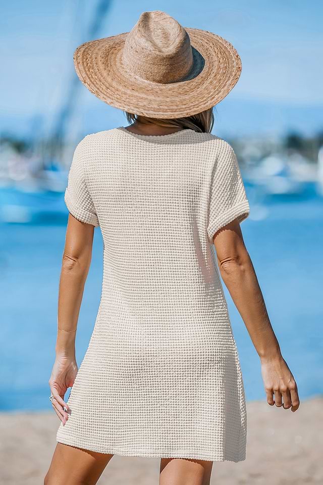 Dale sabor a tu look de playa con el mini pareo de punto tipo gofre de manga corta con dobladillo torcido en color beige. Este pareo aporta un toque diferente, literalmente, con su exclusivo detalle de dobladillo y su cómoda tela de punto tipo gofre.