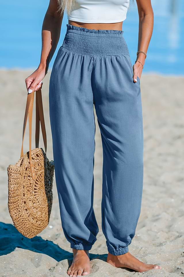¡Los pantalones Best Coast Blue te ofrecen una sensación relajada y playera! Su cintura fruncida y pernera cónica crean un ajuste cómodo que, a la vez, luce impecable.