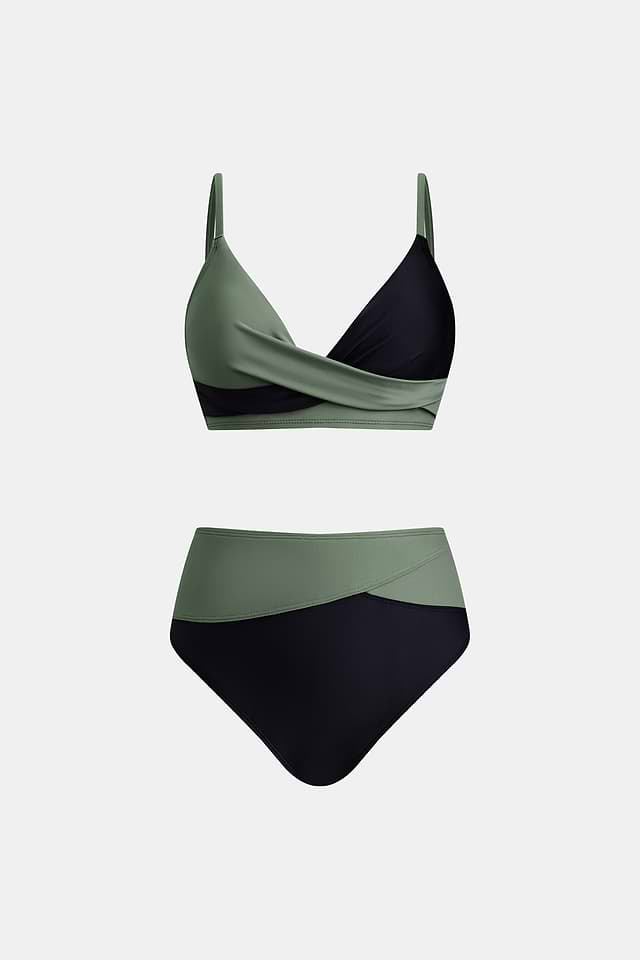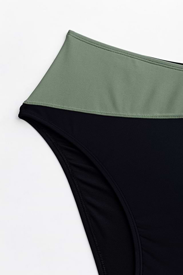 Presentamos nuestro conjunto de top de bikini cruzado y braguitas de talle alto en negro y eucalipto, una combinación moderna de colores clásicos y diseño contemporáneo. Con sus líneas elegantes y su atrevido contraste, este conjunto es el epítome del estilo sin esfuerzo.