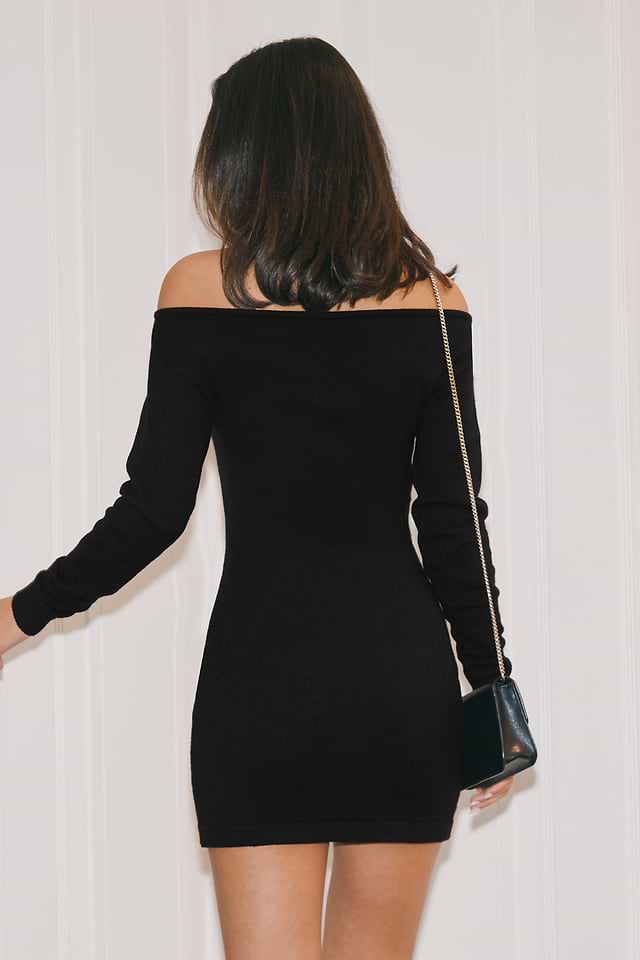 Vestido corto de punto negro con hombros descubiertos y manga larga