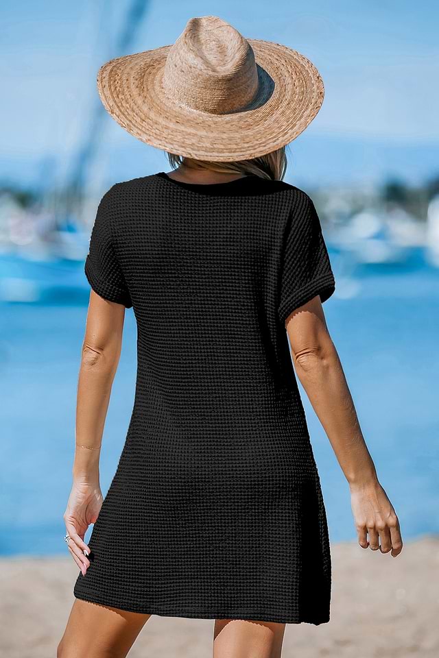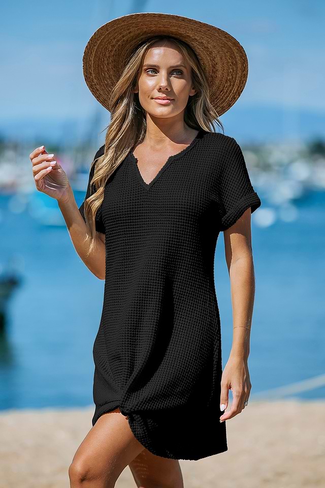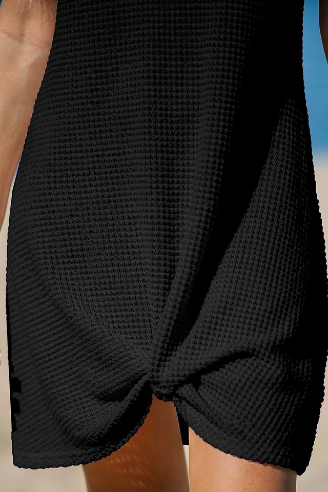 Deja que el minivestido anudado con escote entallado negro le dé un toque divertido a tu look playero. Con su escote entallado y dobladillo anudado, este vestido equilibra un estilo relajado con un toque de elegancia.