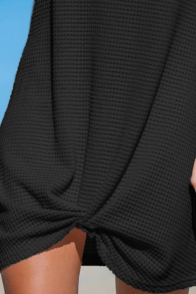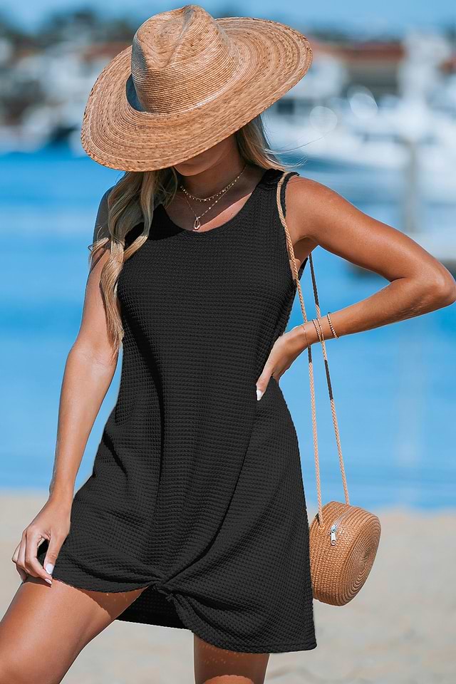 Eleva tu juego de ropa de playa con el mini pareo negro sin mangas con dobladillo retorcido. Su silueta minimalista y su detalle de dobladillo retorcido ofrecen una versión moderna de las prendas de vestir clásicas.