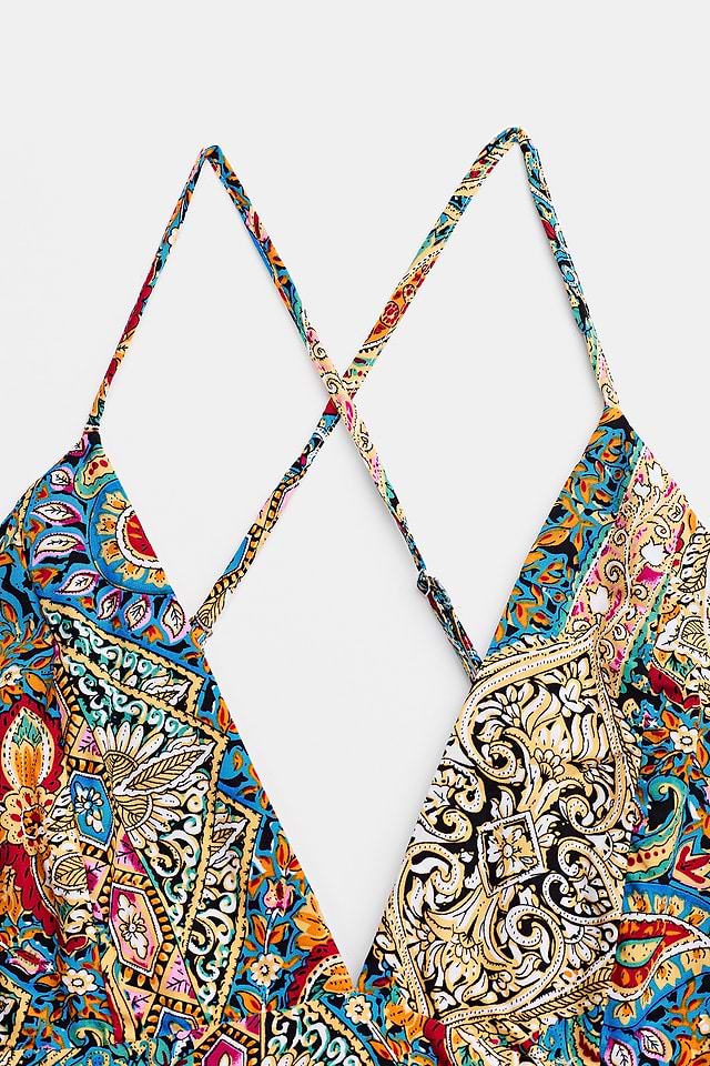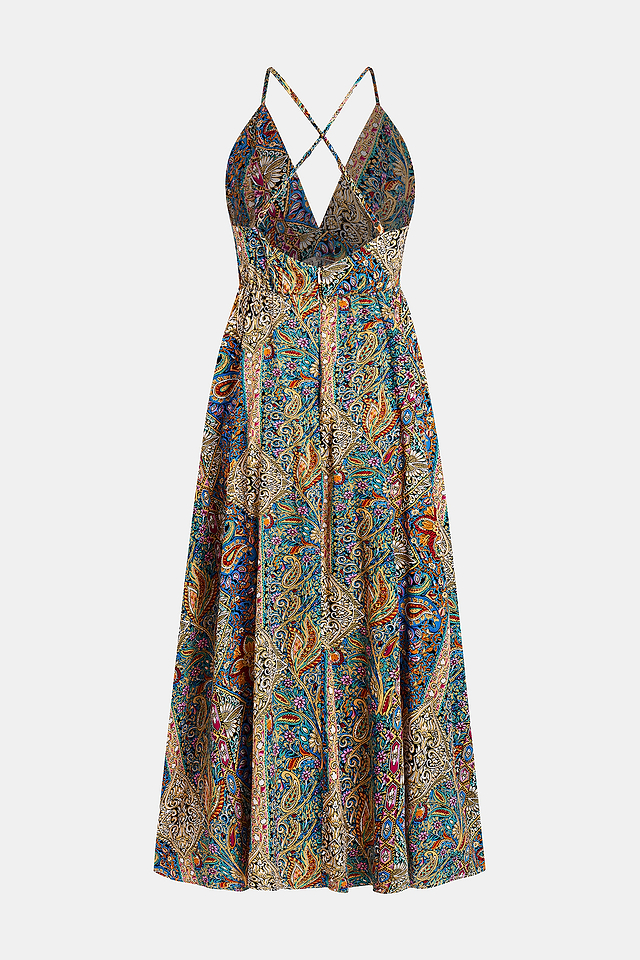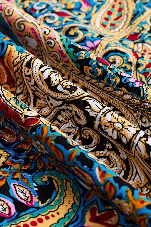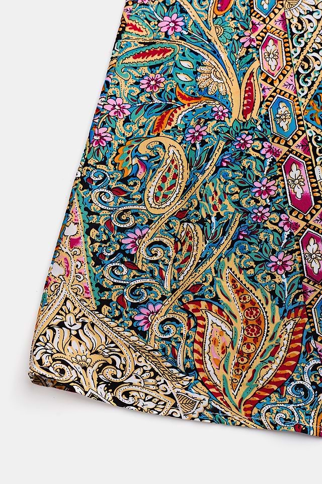 El vestido largo con escote pronunciado y estampado paisley bohemio es una fusión perfecta de feminidad romántica y elegancia relajada. Con un escote pronunciado y tirantes finos, este vestido largo fluido presenta un estampado paisley vibrante que aporta un sutil aire bohemio a cualquier ocasión.