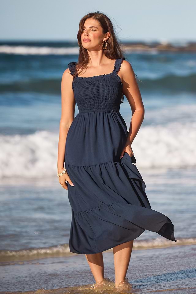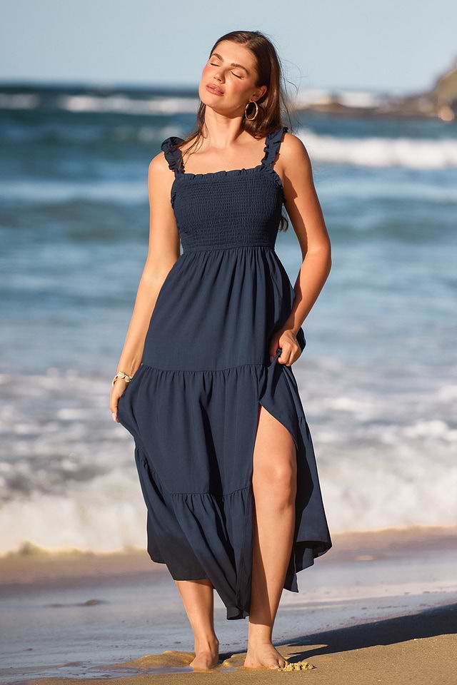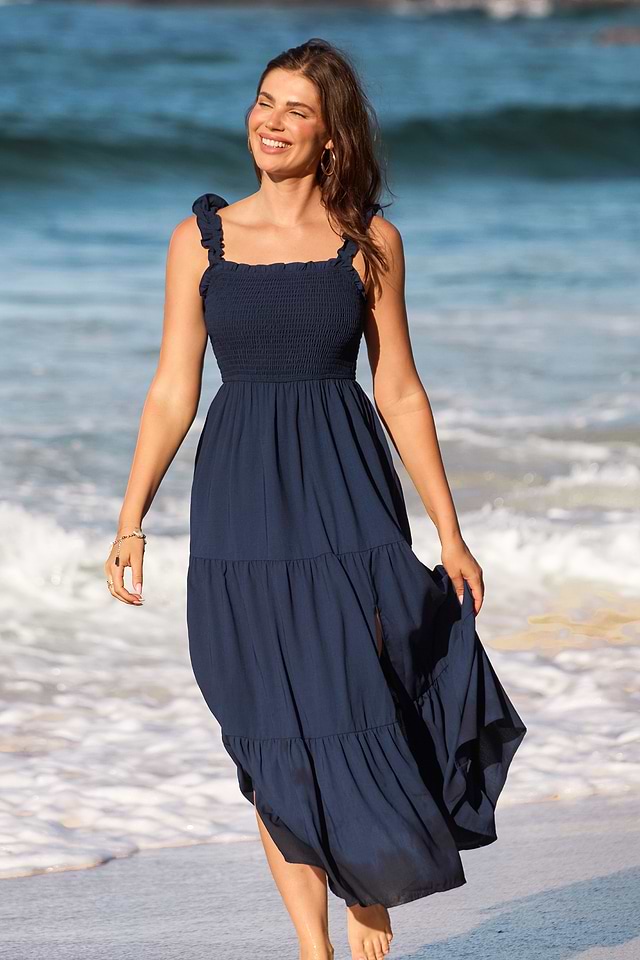 El vestido largo azul Bonus Points es ideal para un estilo soleado y relajado. Su escote cuadrado, corte sin mangas, cintura fruncida y largo maxi lo hacen fresco, favorecedor y perfecto para cualquier plan.