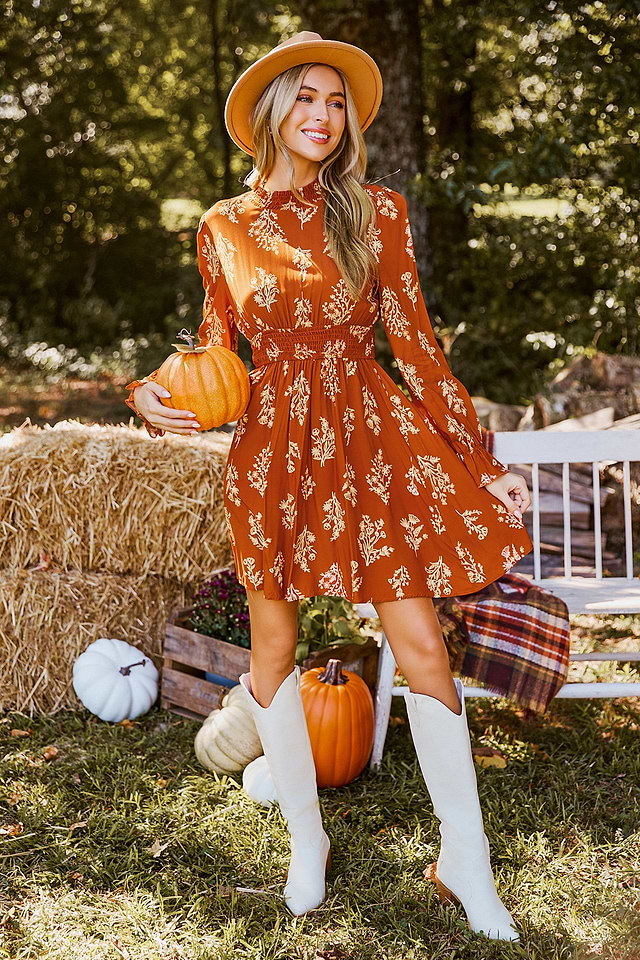 Minivestido con mangas abullonadas y estampado floral en color naranja quemado