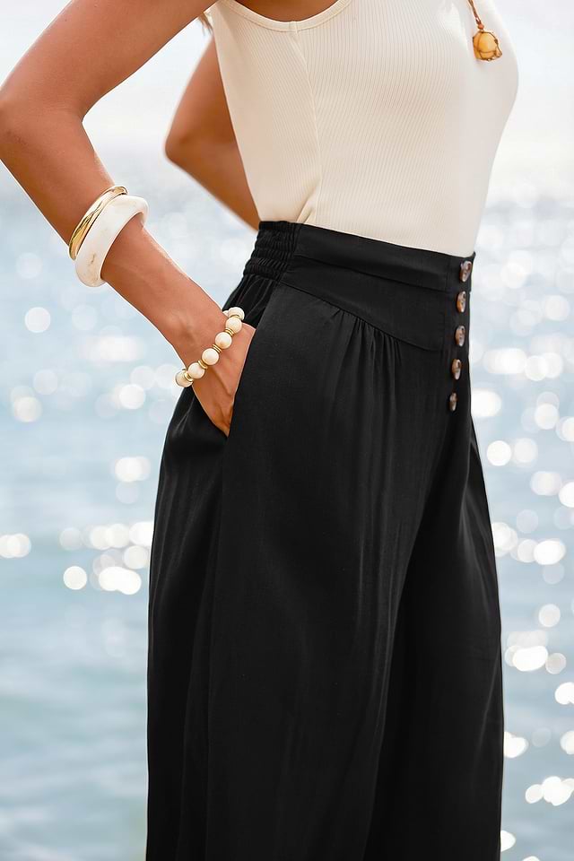 ¡Los pantalones negros Clean Girl te dan un look impecable y elegante! Su cintura fruncida y corte ancho se combinan para crear un ajuste favorecedor y fácil de usar, perfecto para cualquier ocasión.