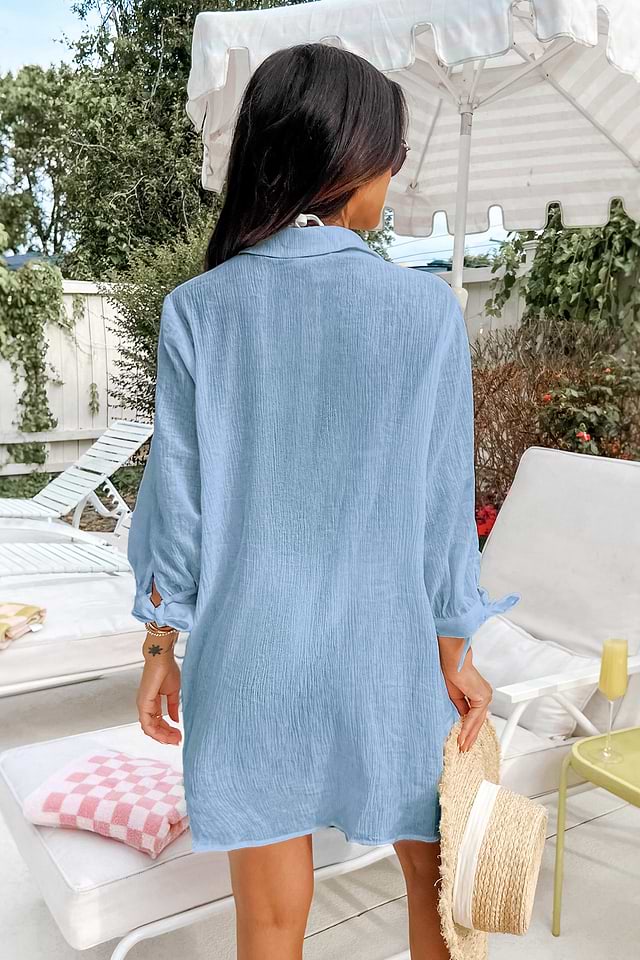 El minivestido azul Clear Day Cover-Up aporta un aire fresco y fresco a tu look playero. El escote y las mangas largas le dan un toque elegante, mientras que su largo mini le da un toque divertido y relajado.