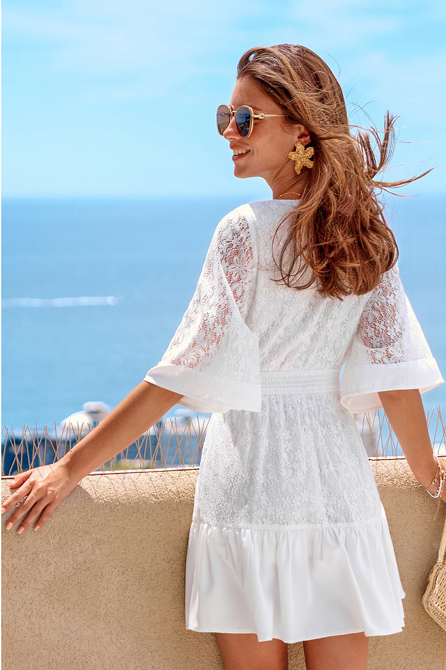 El minivestido blanco Divine Rose es romántico sin ser demasiado elaborado. Su escote cruzado y media manga se combinan con una cintura fruncida y un largo mini para un ajuste favorecedor, ligero y natural.