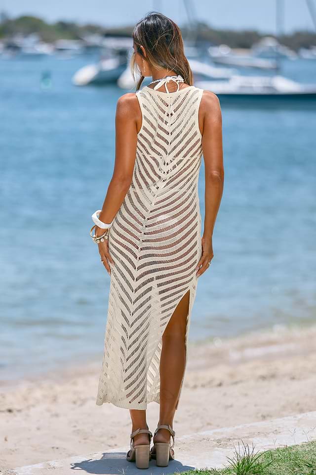El vestido largo Elegance Cream Cover-Up es atemporal y desenfadado. Su escote redondo, sin mangas y largo maxi con abertura en el bajo crean un corte fluido, perfecto para días soleados y paseos al atardecer.