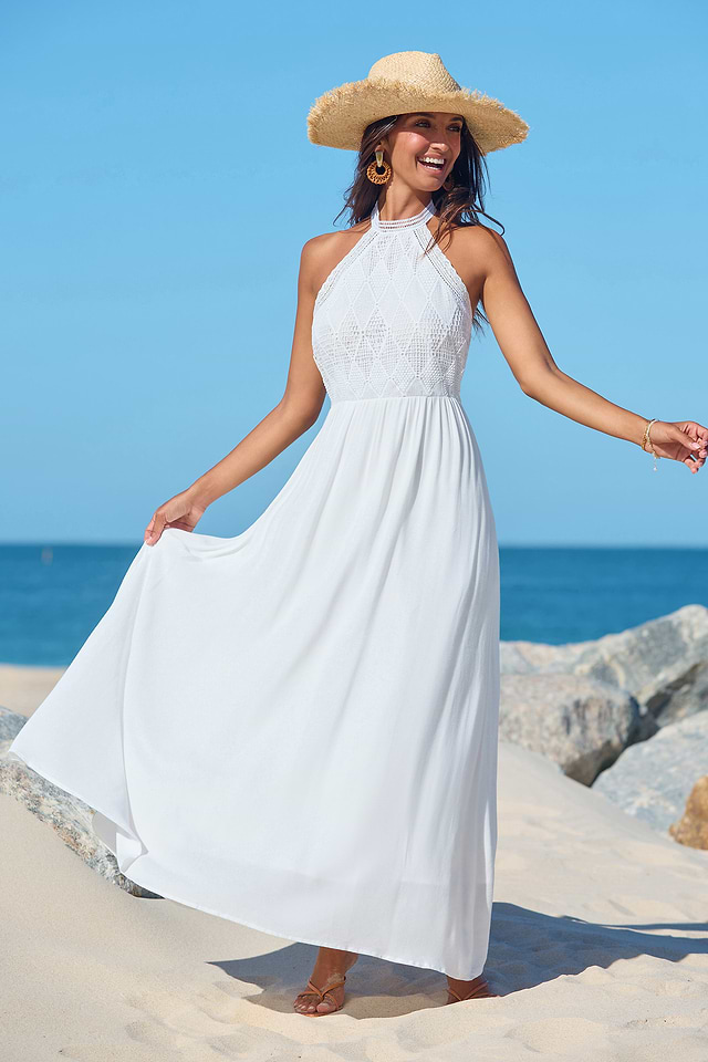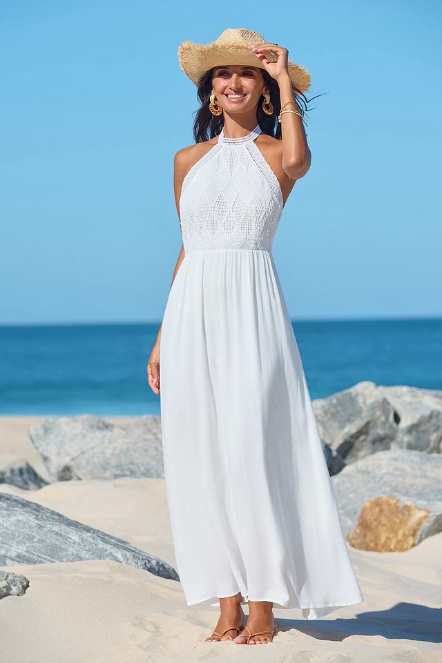 El vestido largo blanco Everlasting Charm es la definición de belleza atemporal. Con escote en V, mangas delicadas y detalles de encaje en contraste, este vestido aporta un toque fresco y clásico a tu guardarropa.