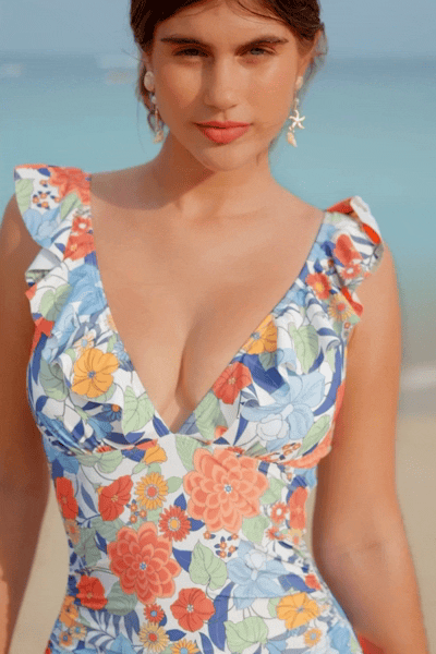 ¿Te sientes coqueta? El traje de baño de una pieza con control de abdomen y tirantes con volados y escote pronunciado con diseño floral presenta un escote espectacular y tirantes con volados para darle un toque romántico. Con control de abdomen para que te sientas fabulosa, ¡es la prenda perfecta para aventuras soleadas!
