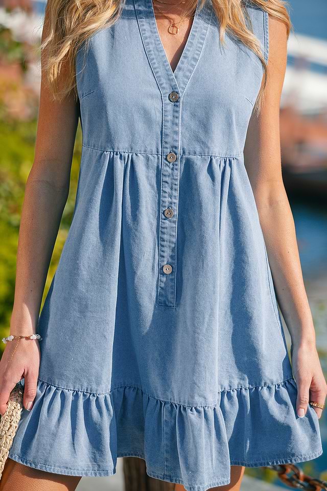 El minivestido French Café Blue es encantador y perfecto para una tarde tranquila. Su escote con muescas y corte sin mangas dan paso a un largo mini para un look favorecedor, relajado y desenfadado.