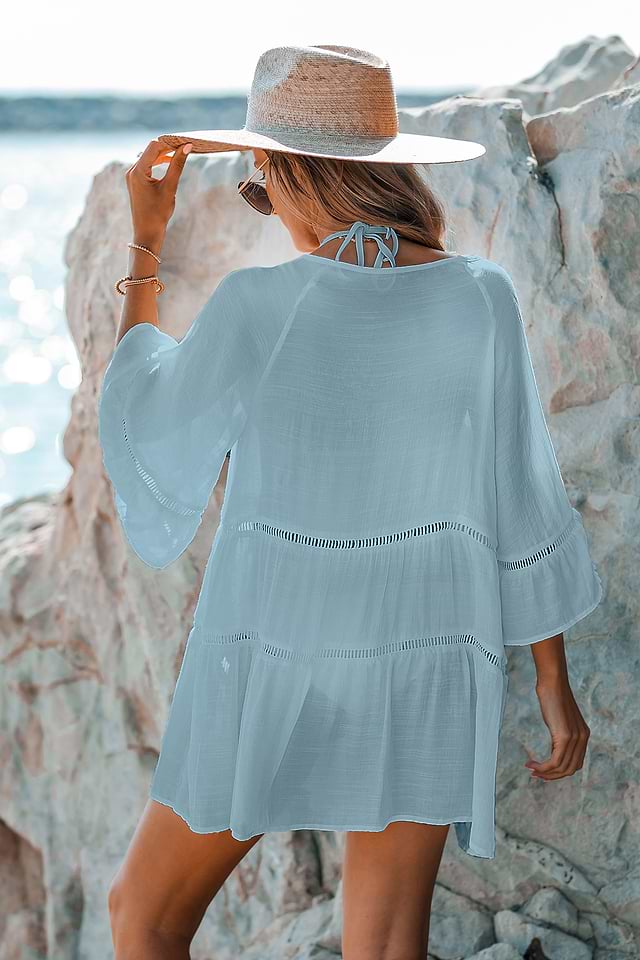 El minivestido azul Fresh Lily es una auténtica bocanada de aire fresco. Con escote redondo, media manga y largo mini, esta prenda combina sencillez y encanto para un look playero relajado y a la vez chic.