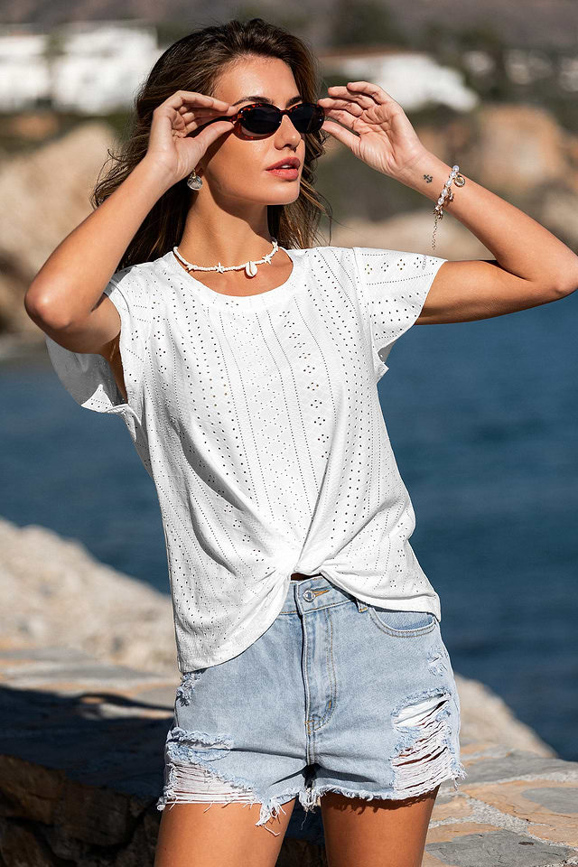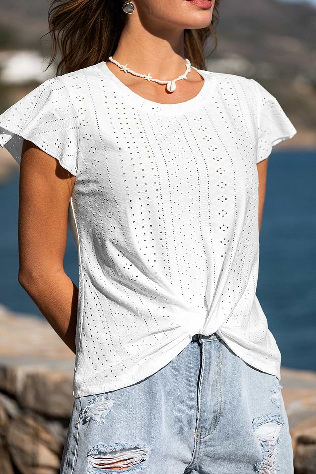 El top blanco Gentle Reminder es suave y cómodo, con un toque dulce y femenino. Su clásico escote redondo se combina con mangas con vuelo y un detalle anudado para un look sencillo pero encantador.