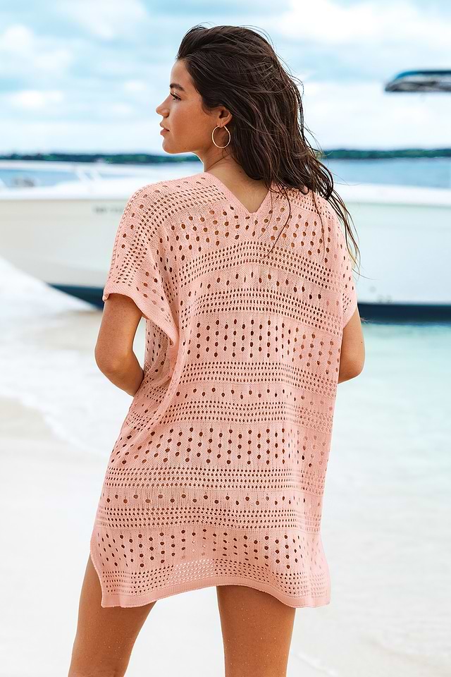 El minivestido rosa malva Good es una opción ideal para pasar el día en la piscina. Su escote en V, manga corta, largo mini y bajo con abertura lo hacen ligero y cómodo, a la vez que elegante y relajado.