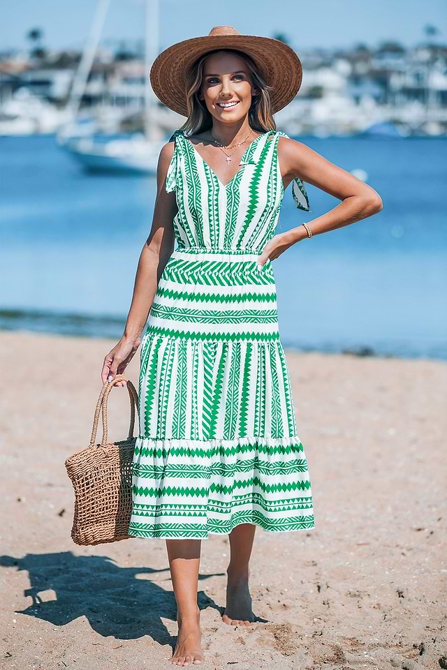 Vestido midi con lazo en los hombros y rayas geométricas en verde y blanco