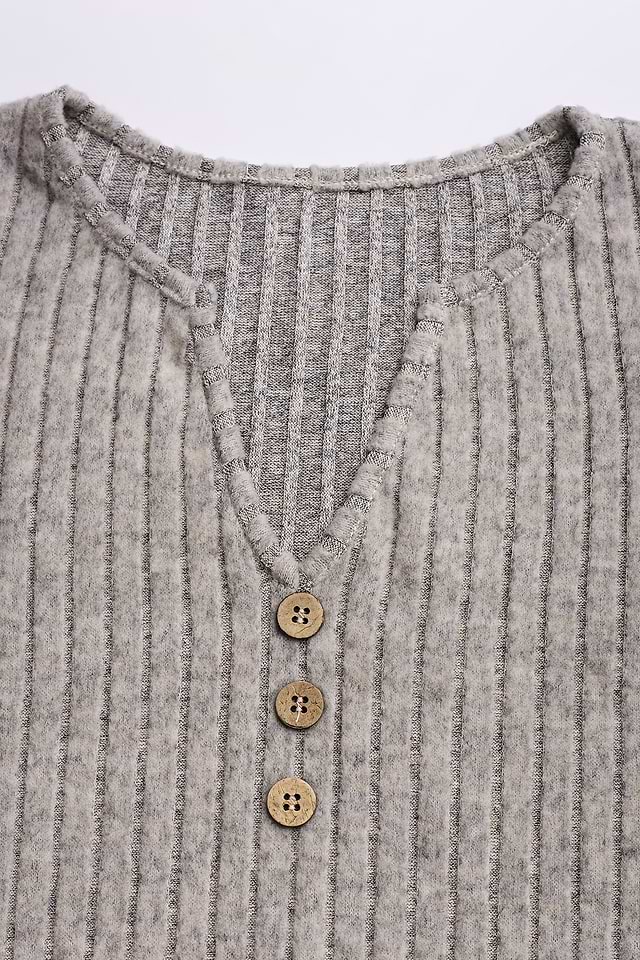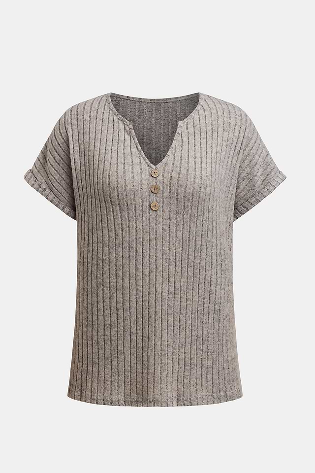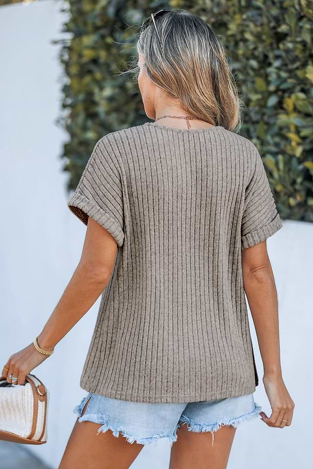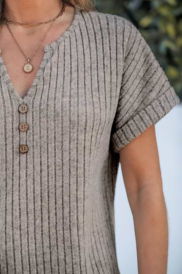 Esta blusa de jersey de manga corta con escote en V gris es un clásico acogedor al que recurrirás una y otra vez. La tela de jersey suave y el escote en V favorecedor la hacen perfecta para los días informales. ¡Una prenda básica versátil que combina con todo!