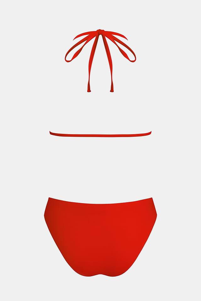 El conjunto de bikini Guava Glow Red es perfecto para los días soleados de playa y para tomar el sol. Su escote en forma de diamante, los tirantes tipo halter y la ligera sujeción del busto crean un look sencillo y relajado, mientras que el corte alto en las piernas y la moderna cobertura de los glúteos le dan un toque divertido.