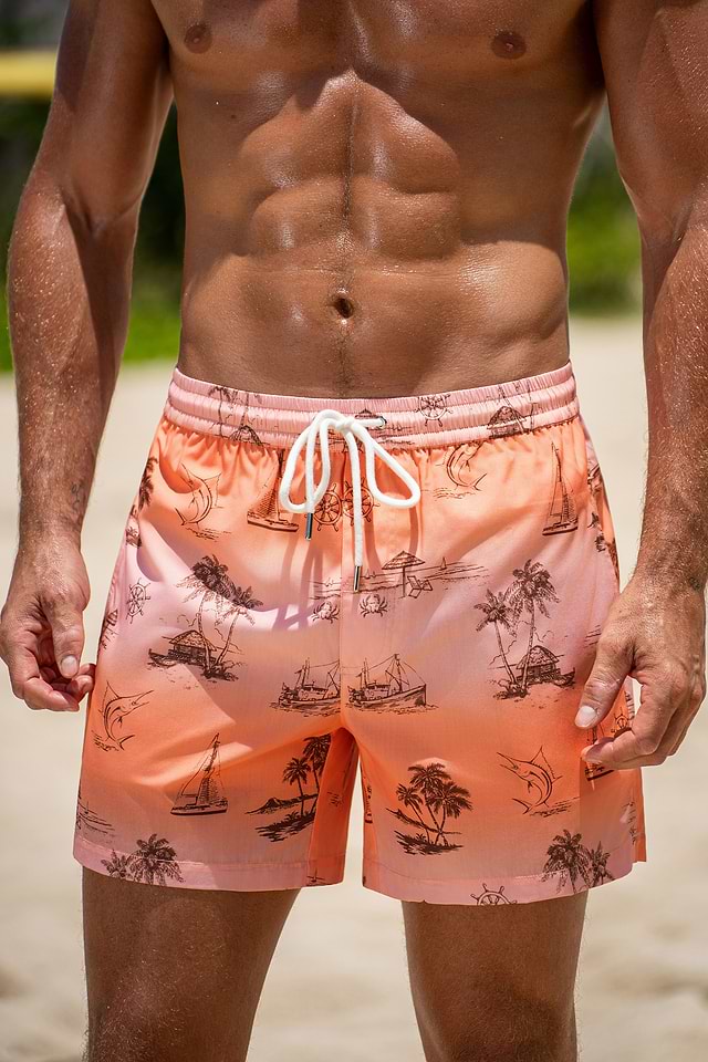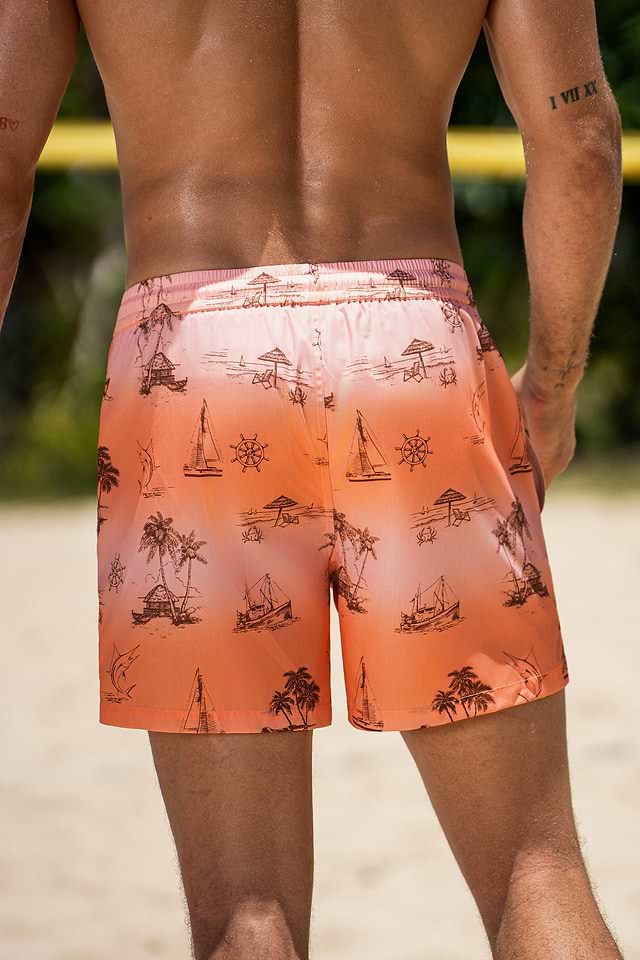 ¡Los shorts de baño tropicales Hazy Sunset le dan un toque tropical a tu colección de trajes de baño! Su cintura con cordón y bolsillo los hacen prácticos, mientras que la entrepierna de 13 cm ofrece un ajuste moderno, cómodo y perfecto para el agua.