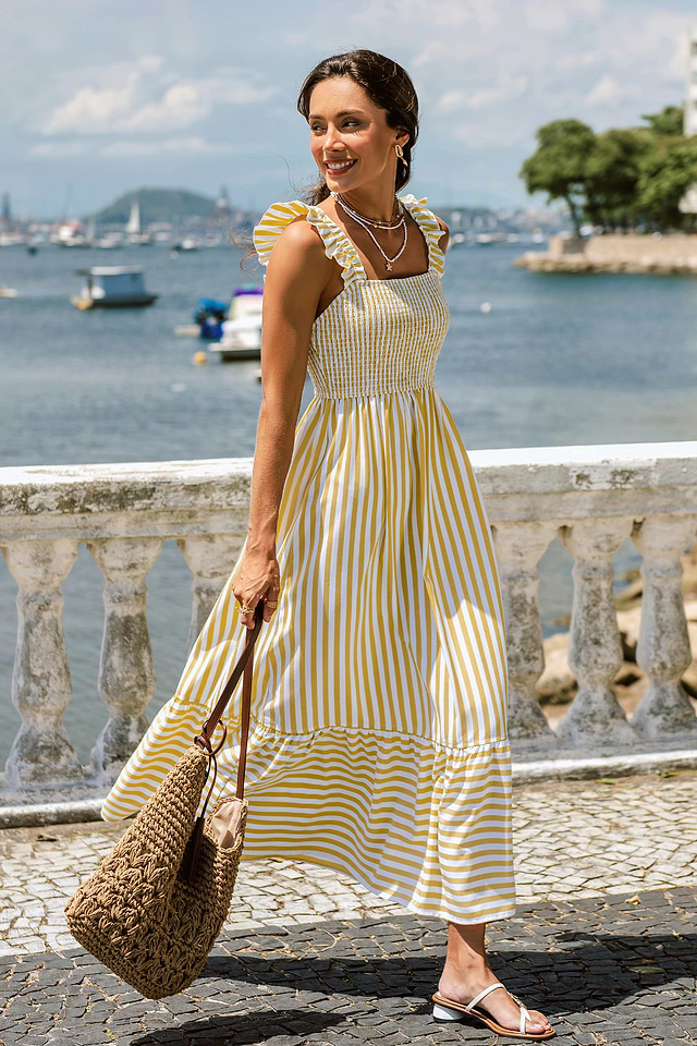 El vestido largo a rayas Honey Sun es cálido y relajado, ideal para los días de verano. Su escote cuadrado, corte sin mangas, corpiño fruncido y largo maxi fluido lo hacen favorecedor y muy llevable.