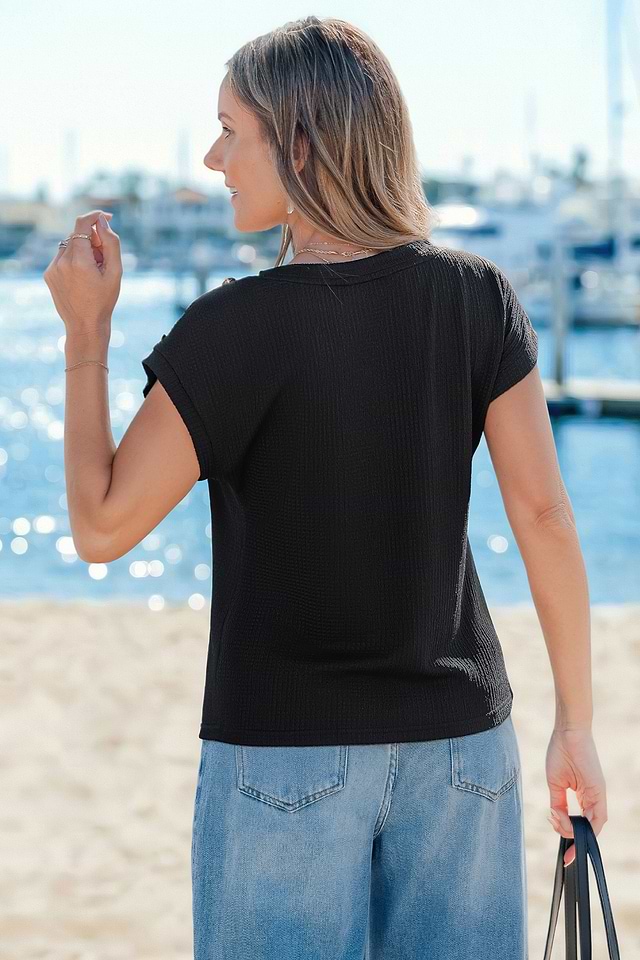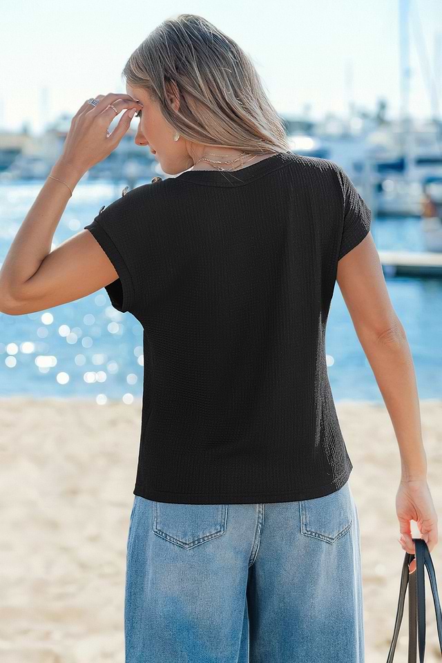 ¡El top negro In Rotation es imprescindible en tu armario! Su escote redondo, mangas cortas y botones falsos lo convierten en una prenda esencial para el día a día.