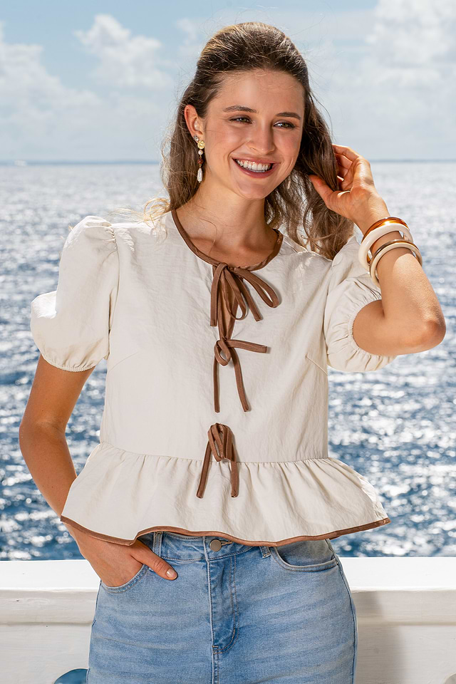 El top neutro It's a Tie le da un toque divertido con un giro inesperado. Su escote redondo y mangas cortas se combinan con un diseño peplum y detalles de lazo para un ajuste ligero y favorecedor que resulta fácil de combinar.