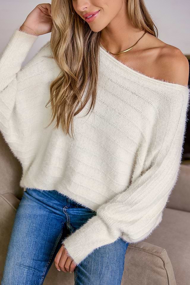Suéter color marfil con hombros descubiertos y mangas abullonadas