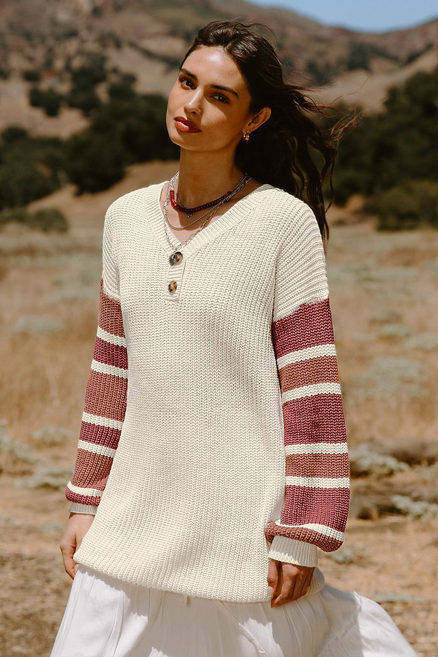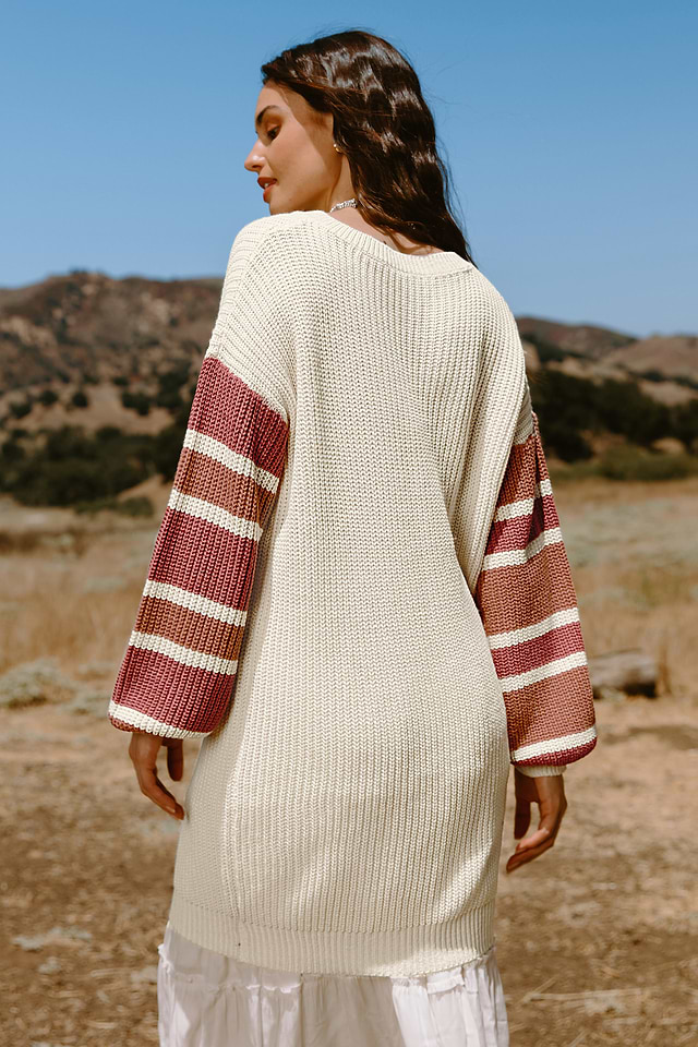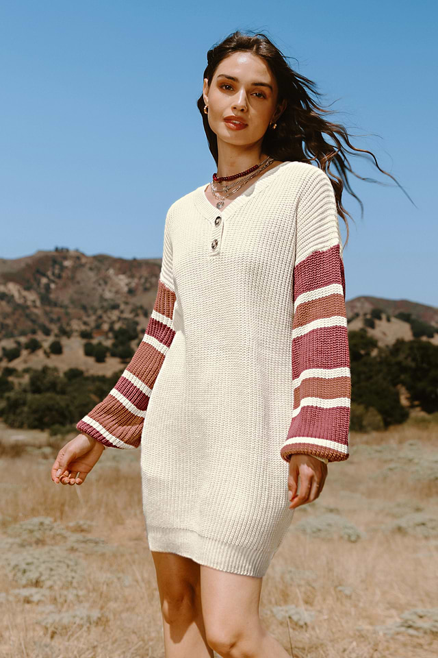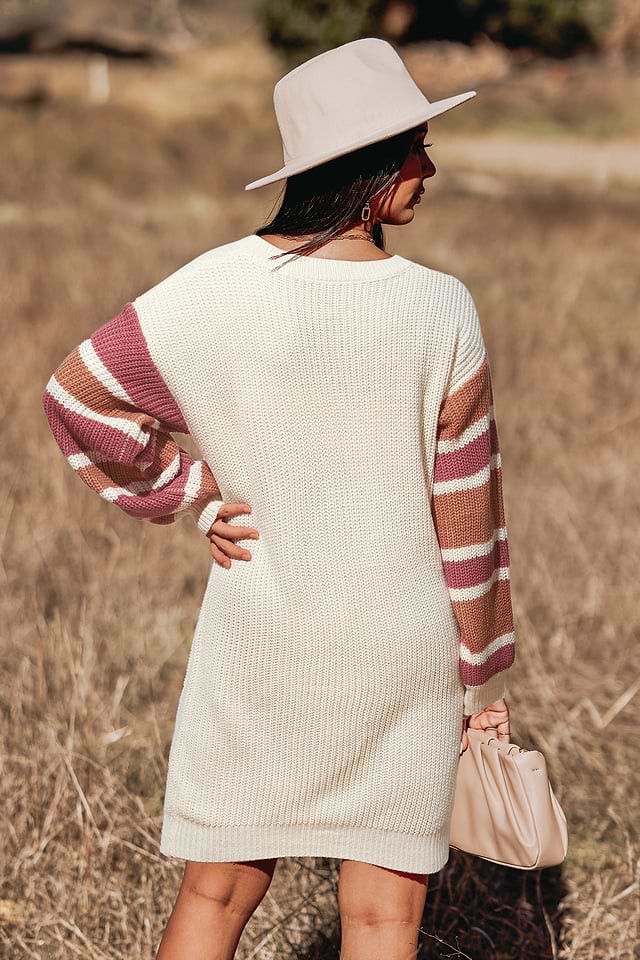 Vestido corto holgado de punto con escote en V y manga larga a rayas