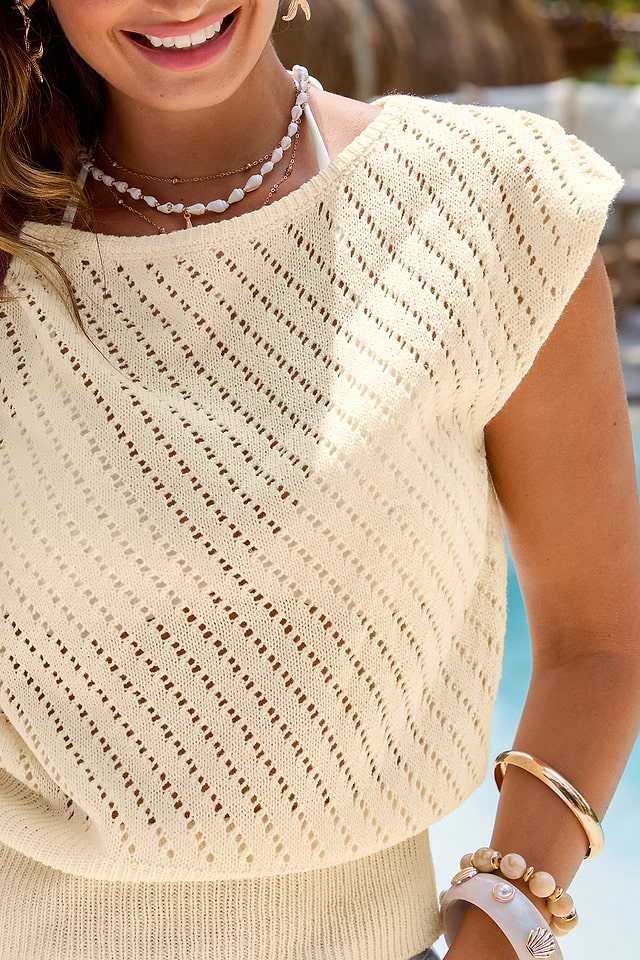 El top playero beige La Jolla Cove es fresco y perfecto para los días soleados junto al agua. Su escote redondo, mangas cortas y cintura ceñida le dan un ajuste relajado y favorecedor.