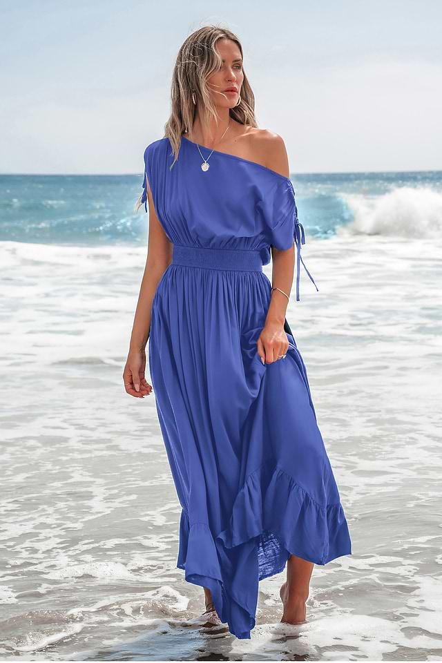 Vestido largo azul claro con hombros descubiertos y cintura fruncida