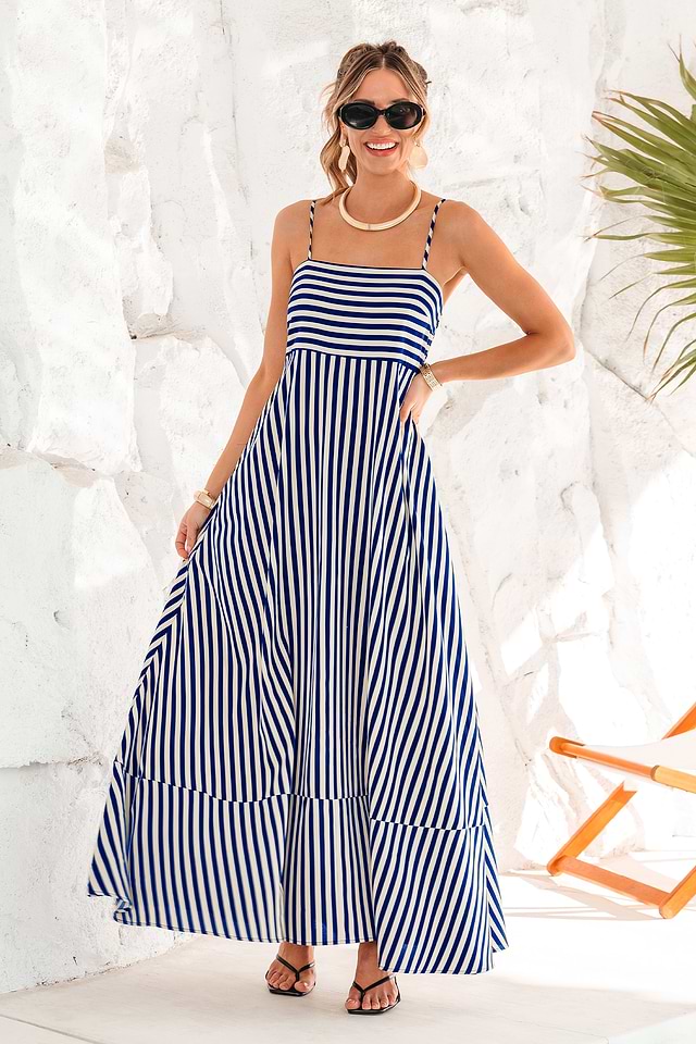 Vestido maxi sin mangas: Vestido maxi a rayas para mujer. Vestido de verano con escote cuadrado. Este vestido largo de tirantes finos presenta tirantes finos ajustables, espalda fruncida y bolsillos laterales. Ofrece comodidad y un encanto contemporáneo. Su sutil estampado de rayas le aporta una elegancia atemporal. Perfecto para salidas de verano o vacaciones.