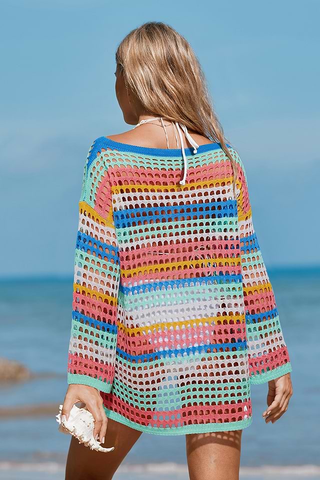 ¡El top de rayas Miami es un favorito coqueto! Su escote con hombros descubiertos, mangas largas y largo mini lo hacen ideal para usar tanto en la playa como en el paseo marítimo.