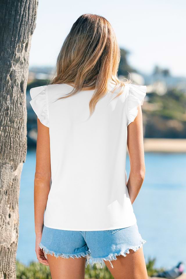 ¡El top blanco My Dream es una de esas prendas que te enamoran al instante! Su escote en V y mangas con volantes se combinan con un delicado ribete de ojales para un look suave y bonito, fácil de llevar.