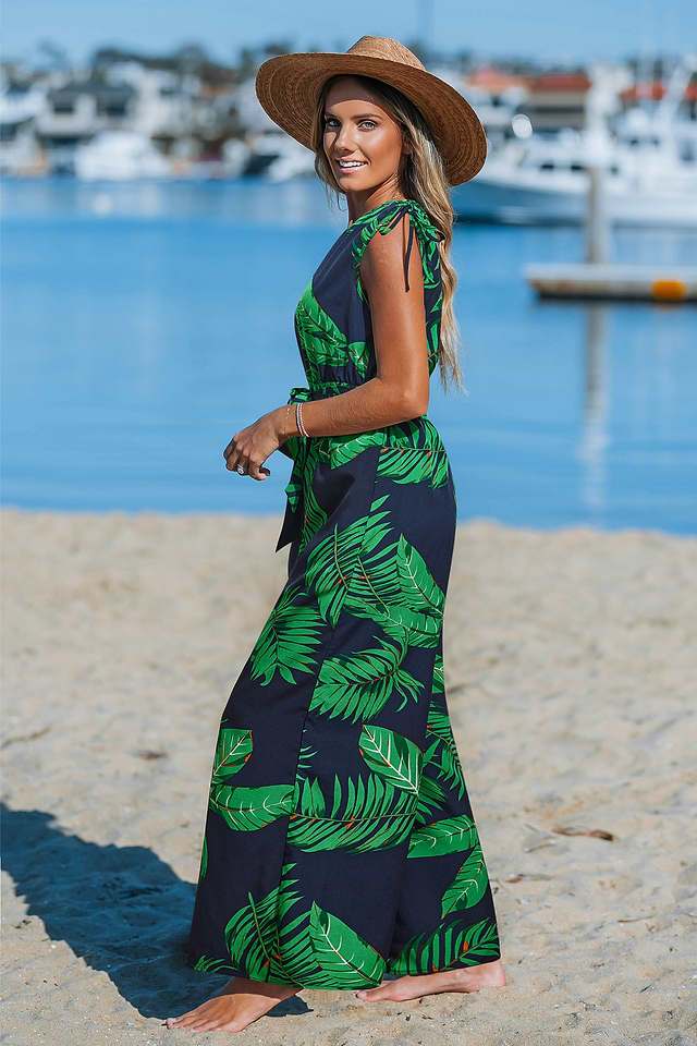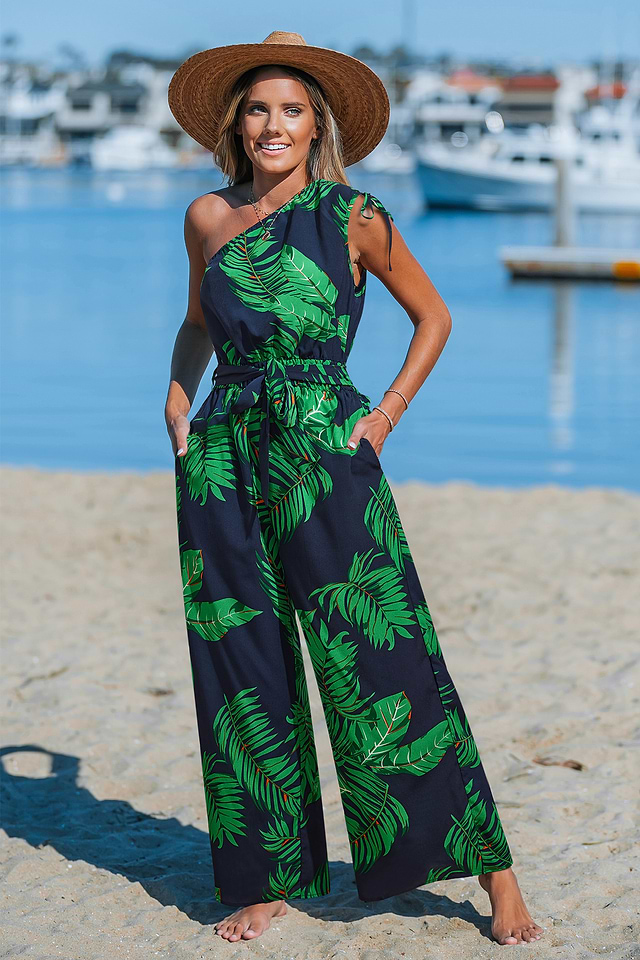 El mono Paradise Found Tropical le da a tu look un toque atrevido de inspiración isleña. Con un llamativo escote asimétrico, un solo hombro y un favorecedor lazo en la cintura, este mono tejido fluye con naturalidad con su silueta de pierna ancha, perfecto para días de vacaciones o noches cálidas.