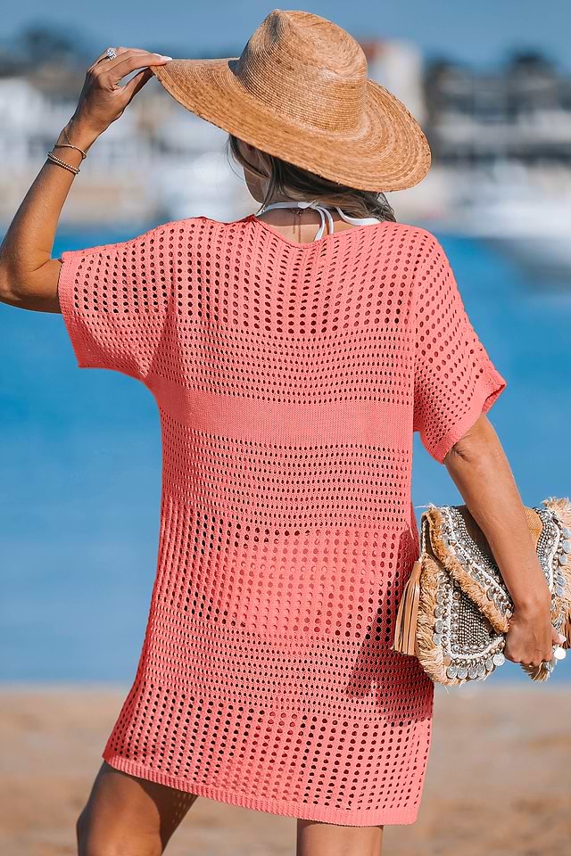 El minivestido rosa coral te trae toda la energía relajada y soleada que buscas junto al agua. Su escote en V y mangas cortas se extienden hasta un largo mini con un dobladillo dividido para un ajuste fresco y favorecedor que se adapta a tus movimientos.