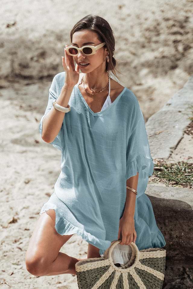 El rayón, ligero y transpirable, está diseñado para días cálidos. Aunque puede arrugarse y encogerse, con un poco de cuidado se mantendrá fresco. Envuélvete con este pareo informal, fresco y semitransparente con volantes. La tela semitransparente y el volante le dan un toque romántico, convirtiéndolo en el pareo perfecto para un día junto al agua.