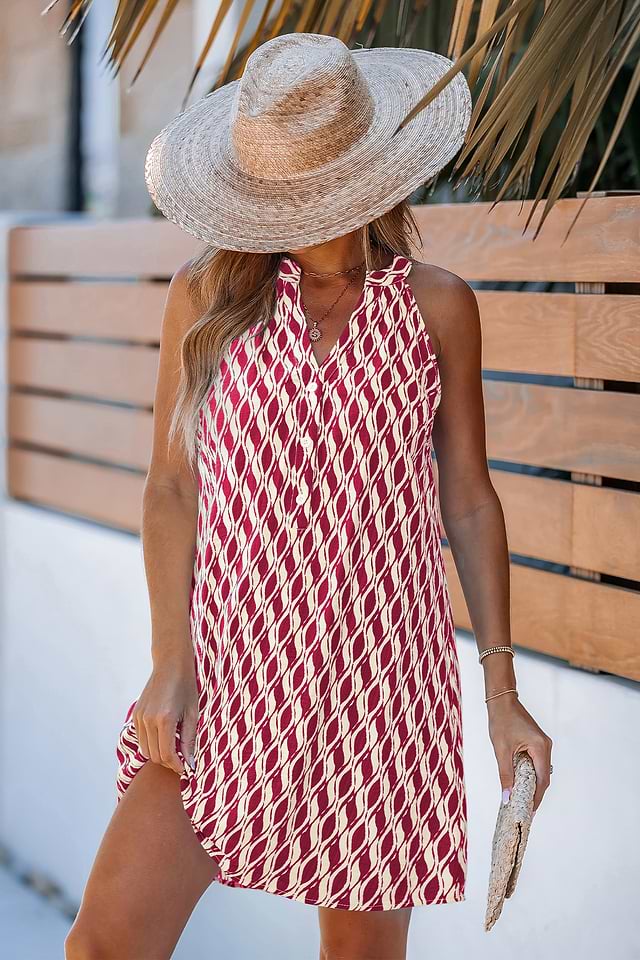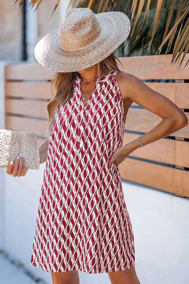 El minivestido She's All That Abstract es perfecto para una energía coqueta y divertida. Su escote con muescas, corte sin mangas y largo mini lo hacen ligero, divertido y listo para cualquier plan.