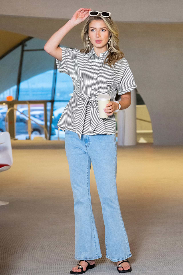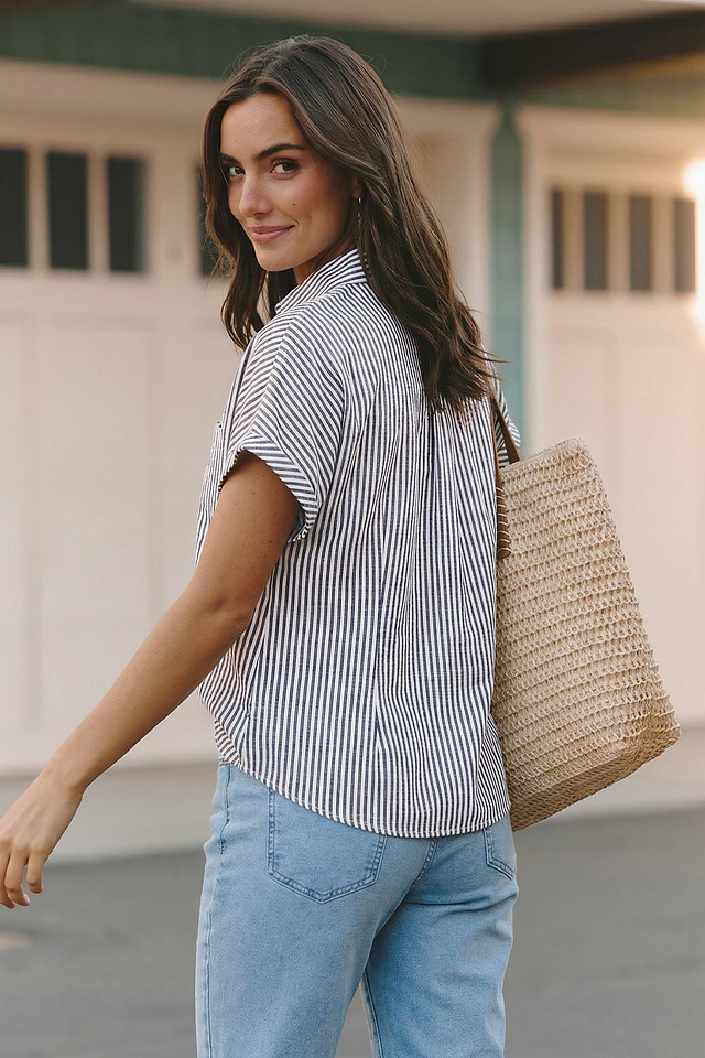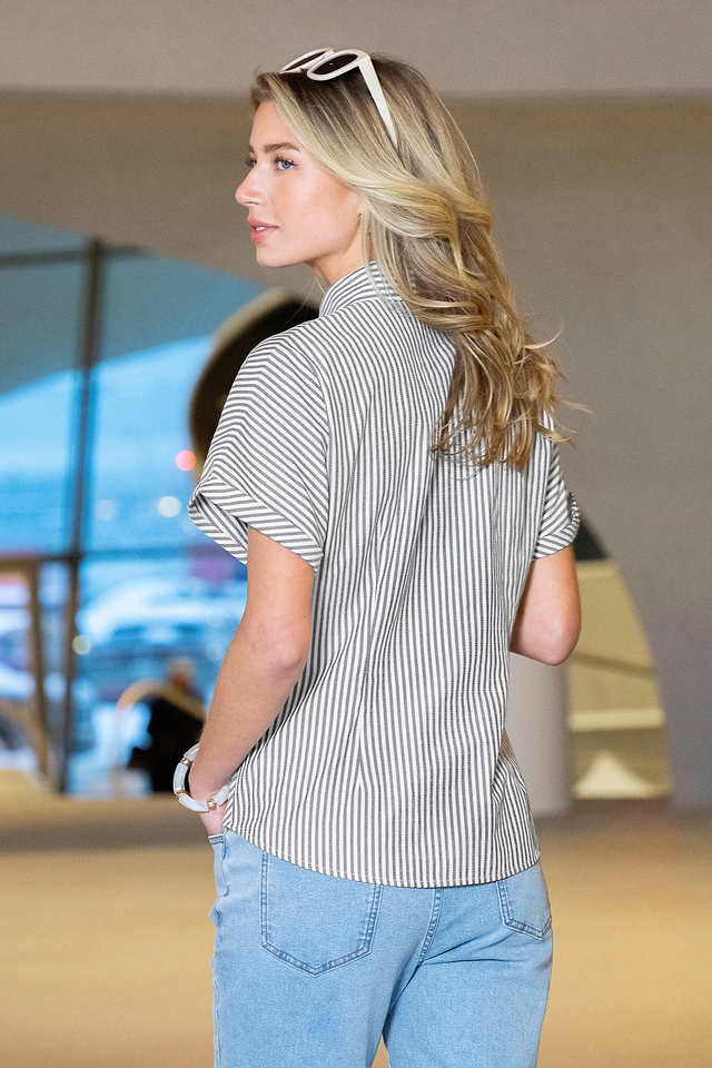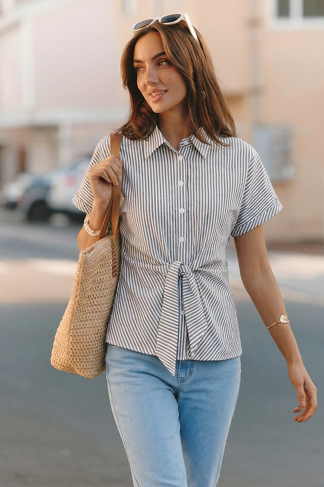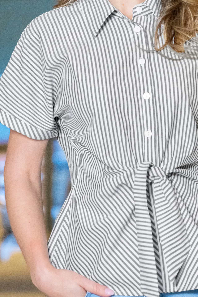La blusa de rayas Show Off es una opción ideal si buscas algo divertido pero a la vez elegante. Su cuello y mangas cortas se combinan con un nudo frontal y un detalle de botones para un estilo favorecedor y relajado que te quedará genial todo el día.