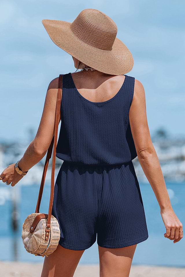 El mono azul Slow Lane está hecho para días tranquilos y relajados. Con escote redondo, corte sin mangas y pernera ancha, es una prenda integral que sienta tan bien como luce.